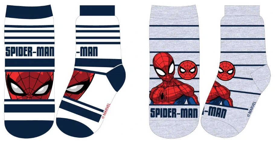 Chlapecké ponožky v designu hrdiny Spiderman, sada 2 ks párů, 1 bílomodré s potiskem, materiál: 76% bavlna+ 23% polyester + 1% elastan a 1 pár šedé s potiskem, materiál: 60% bavlna + 21% polyester + 18% polyamid + 1% elastan. Ponožky perfektně přiléhají k noze, nestlačují a zároveň perfektně drží na noze a zajišťují vysoký komfort nošení. Ponožky jsou velmi pohodlné a díky použití kvalitních materiálů odolné proti praní a oděru. Měkké na dotek.