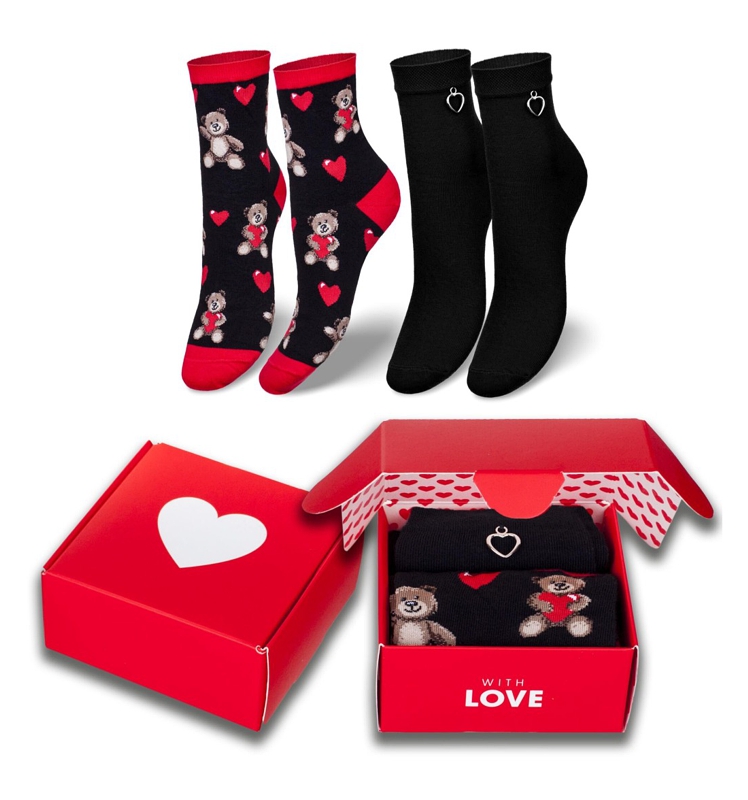 Dámské trendy ponožky vyrobené z vysoce kvalitní bavlny - sada 2 párů s Valentýnským motivem v dárkové krabičce. Jeden pár je s motivem medvídka a srdíčka, druhý pár ponožek je jednobarevný - černý s příveskem srdíčka. Barevné dámské ponožky v módních vzorech a barvách. Perfektně sedí na noze a poskytují vysoký komfort nošení. Složení: 75% Bavlna, 20% Polyamid, 5% Elastan.