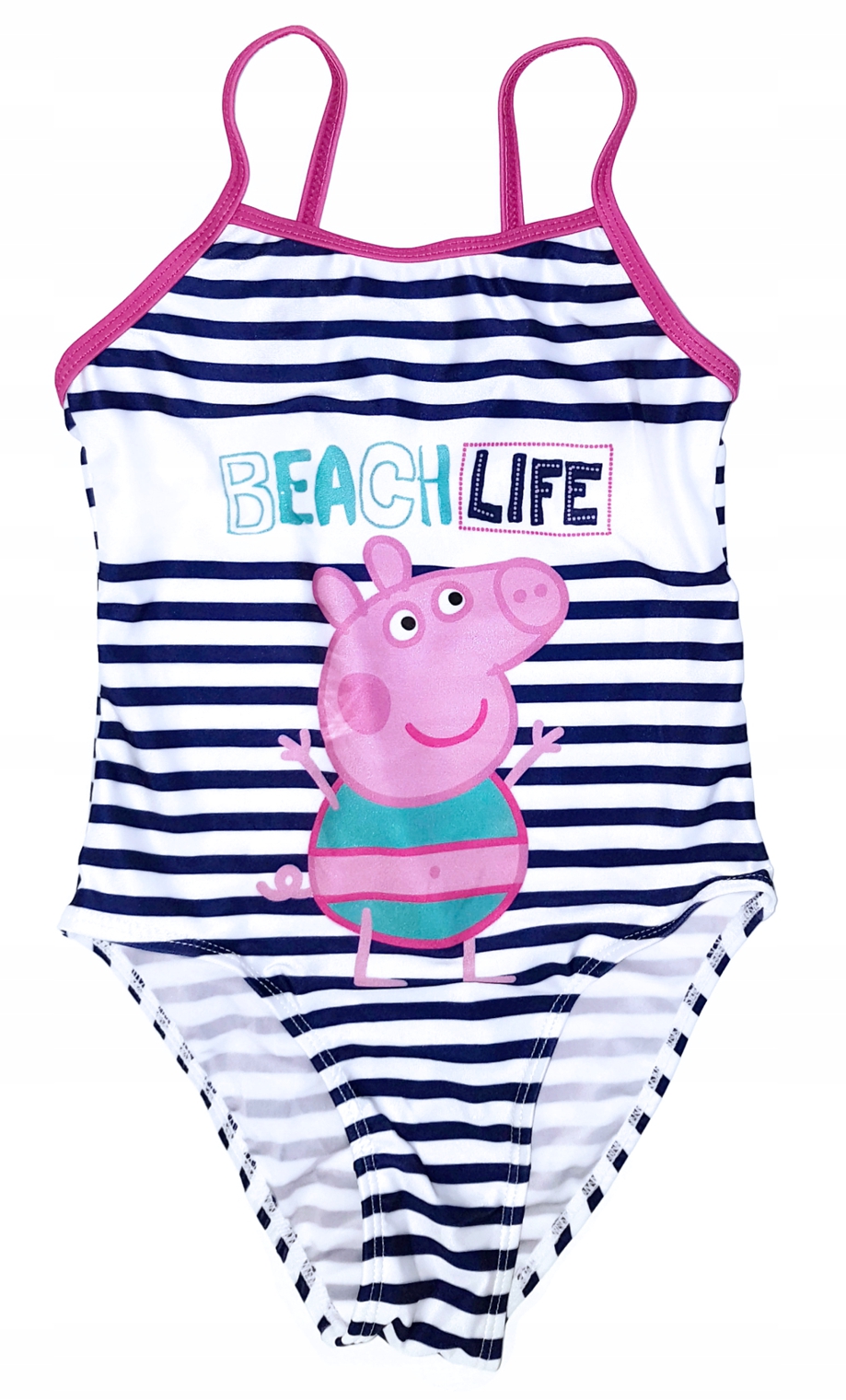 Dívčí jednodílné plavky s motivem prasátko Peppa Pig, materiál: 88% polyester + 12% elastan, 200 gsm, barva bílá s modrým proužkem a s barevným potiskem.