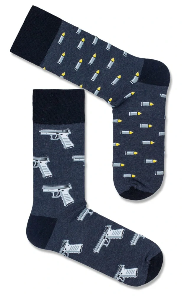 Pánské trendy ponožky vyrobené z vysoce kvalitní bavlny s motivem zbraní a nábojů, nestejné, ale ladící motivem. Barevné pánské ponožky v módních vzorech a barvách. Perfektně sedí na noze a poskytují vysoký komfort nošení. Jsou ideální pro každodenní styling, pro lidi, kteří si cení pohodlí. Složení: 75% Bavlna, 20% Polyamid, 5% Elastan, barva tmavě šedá v kombinaci s černou.