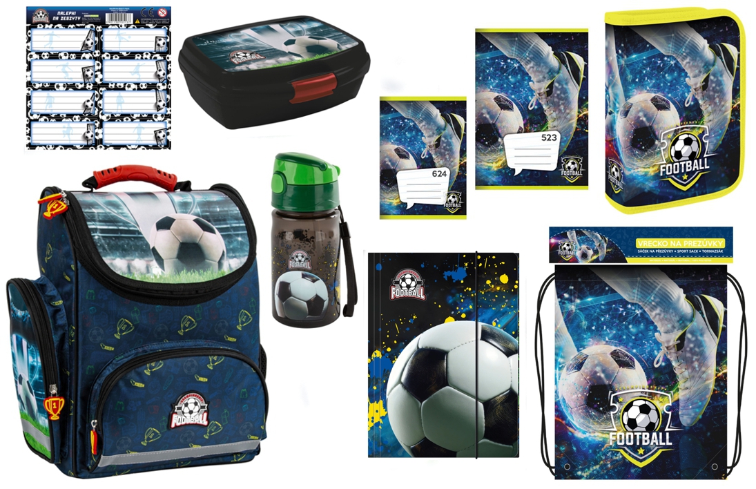 Zvýhodněný školní set z kolekce fotbal obsahuje 9 ks - školní ergonomický batoh - aktovku, jednopatrový penál bez výbavy, sáček na přezůvky, spisovou složku A4, svačinový box, láhev na pití premium, sešit A5, sešit A6 a jmenovky.